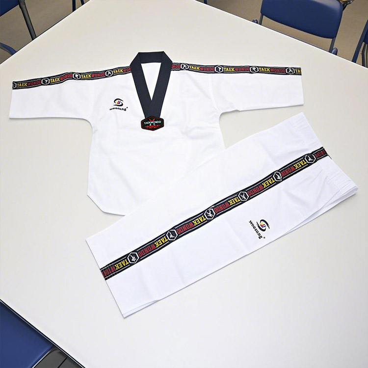 WOOSUNG fabrica variarum instrumentorum Taekwondo est professio. Nostrae vestes striatae Taekwondo fiunt ex fabricae cinematographicae spirabiles, cum cingulis sutura, stringis in braccas firmatis, et pads genu, easque durabiles, flexibiles, et ad scenici formandas aptas efficiunt.
